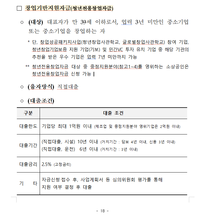 · 대상: 대표자가 만 39세 이하로서, 업력 3년 미만인 중소기업 또는 중소기업을 창업하는 자