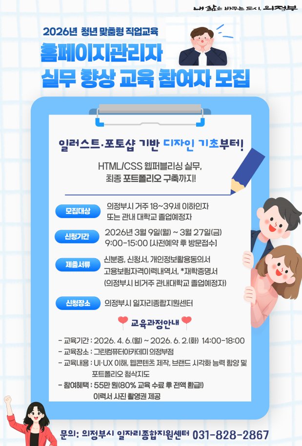 의정부시 청년구직자(18~39세)를 대상으로 ʳ홈페이지관리자 실무 향상 과정ʴ을 운영하고자 하오니 많은 관심과 참여바랍니다.