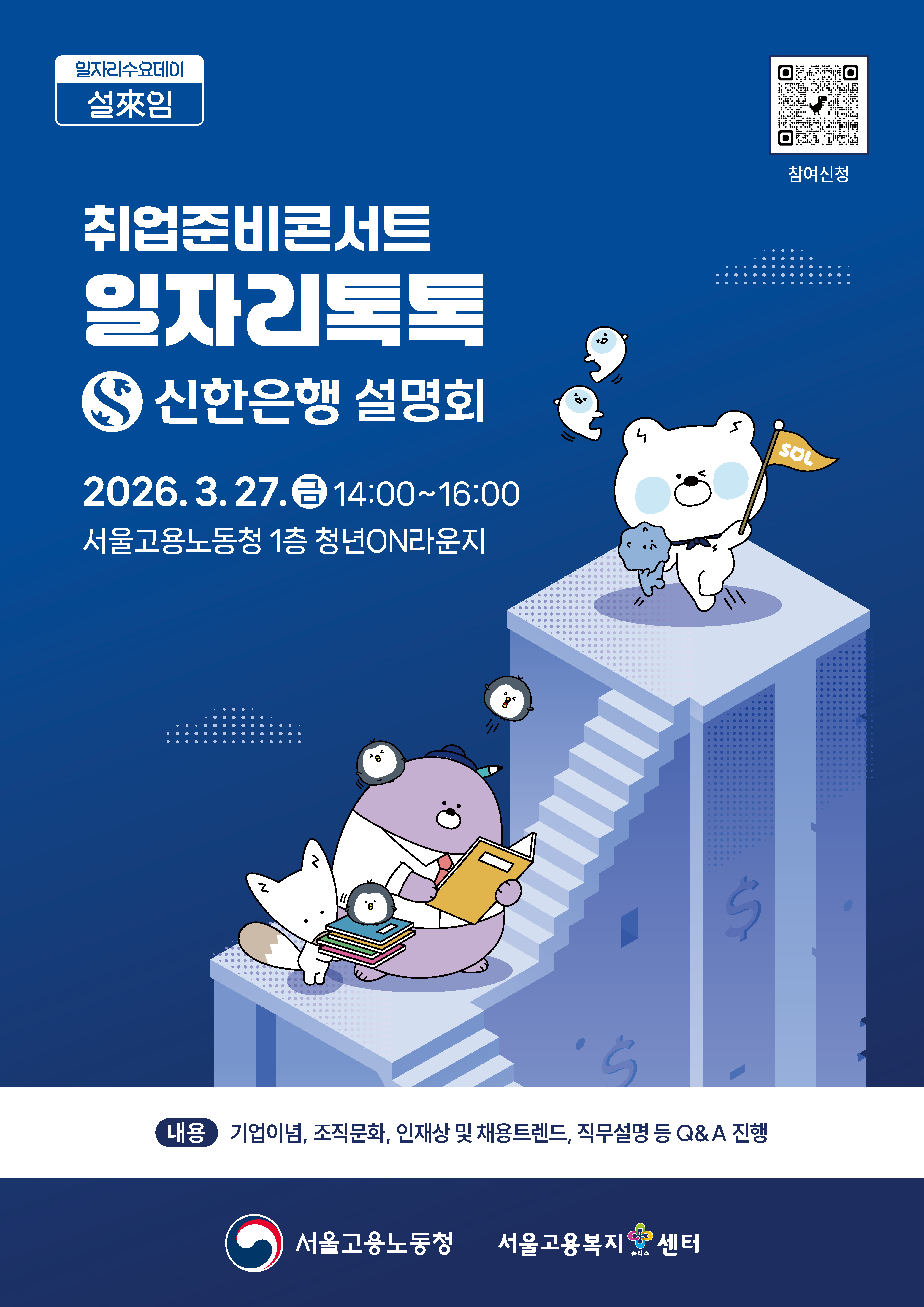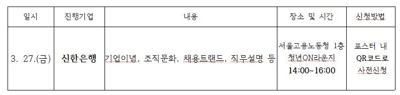 2. 위와 관련하여 아래와 같이 취업준비콘서트_일자리 톡톡_[신한은행]을 개최하오니, 많은 청년들이 참석할 수 있도록 홍보에 적극 협조하여 주시기 바랍니다.