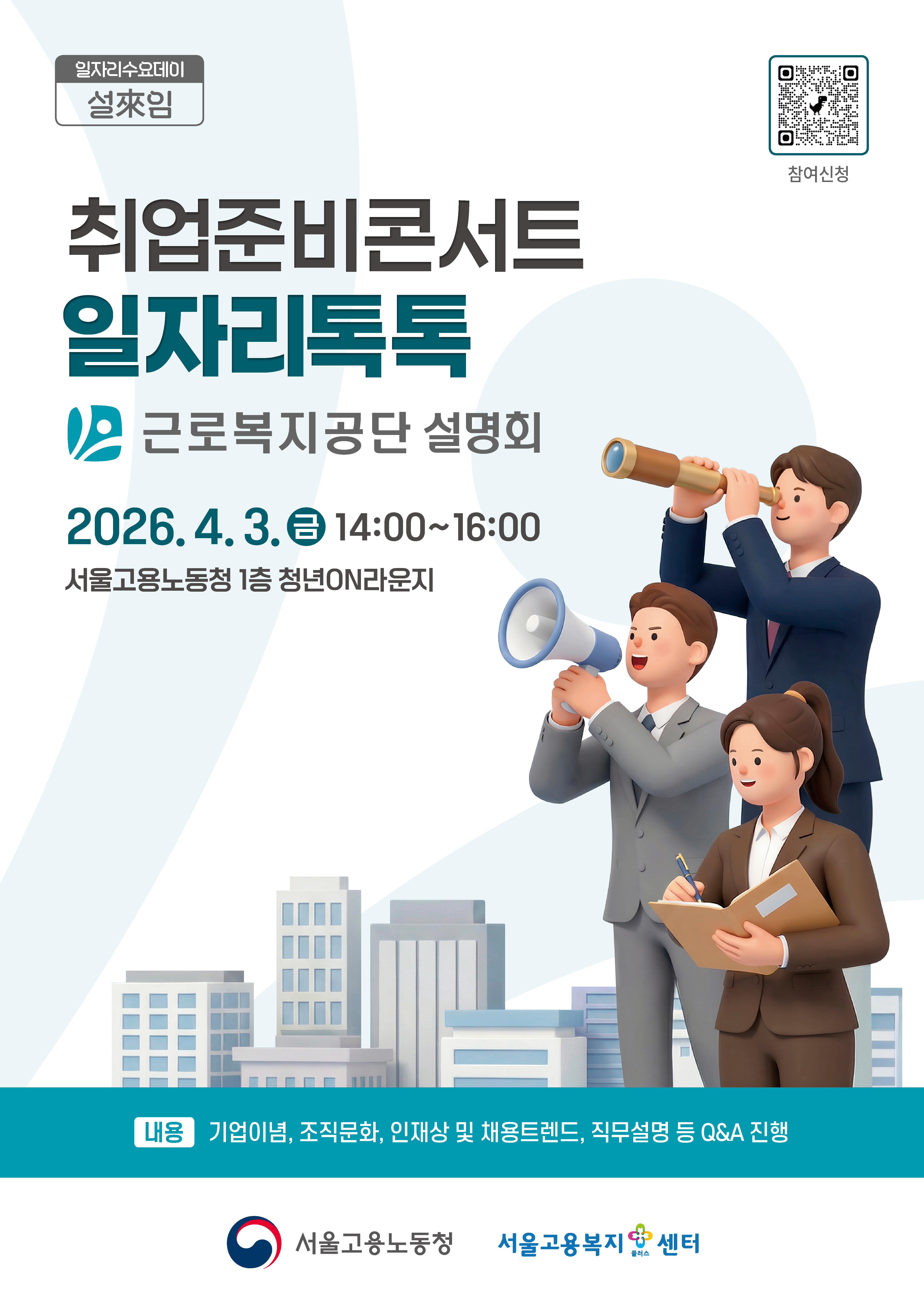 1. 우리센터에서는 기업은 적합한 구직자 매칭 및 청년층 대상의 대외 홍보 효과를, 지역청년들은 해당 기업의 인재상을 사전에 파악하여 실질적인 취업준비를 할 수 있는 중요한 기회를 제공하기 위해 「2026 서울고용노동청과 함께하는 취업준비콘서트_일자리 톡톡(Talk Talk)」을 진행합니다.
