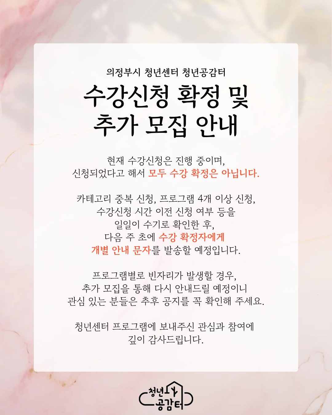 다음 주 초에 수강 확정자에게 개별 안내 문자를 발송할 예정입니다.