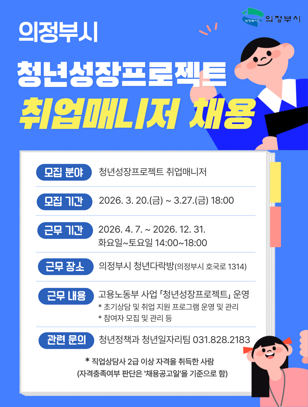 관련 분야에 관심 있는 분들의 많은 지원 바랍니다. ○ 모집인원: 1명 ○ 접수기간: 2026. 3. 20.(금) ~ 3. 27.(금) ※ 의정부시 일자리종합지원센터 방문접수 ○ 근무기간: 2026. 4. 7. ~ 12. 31. ○ 근무장소: 의정부시 청년다락방 ○ 서류전형 합격자 발표: 2026. 3. 31.(화)